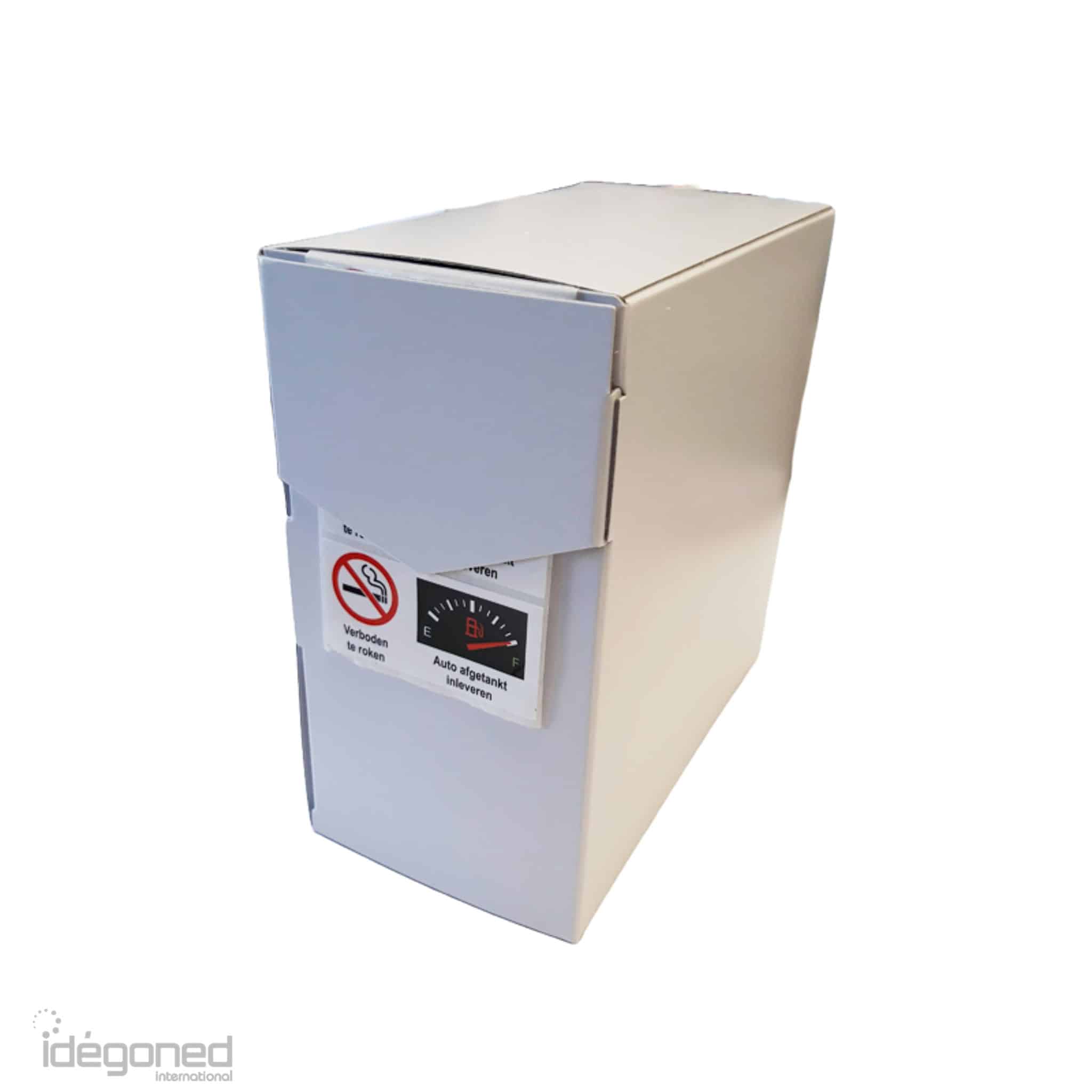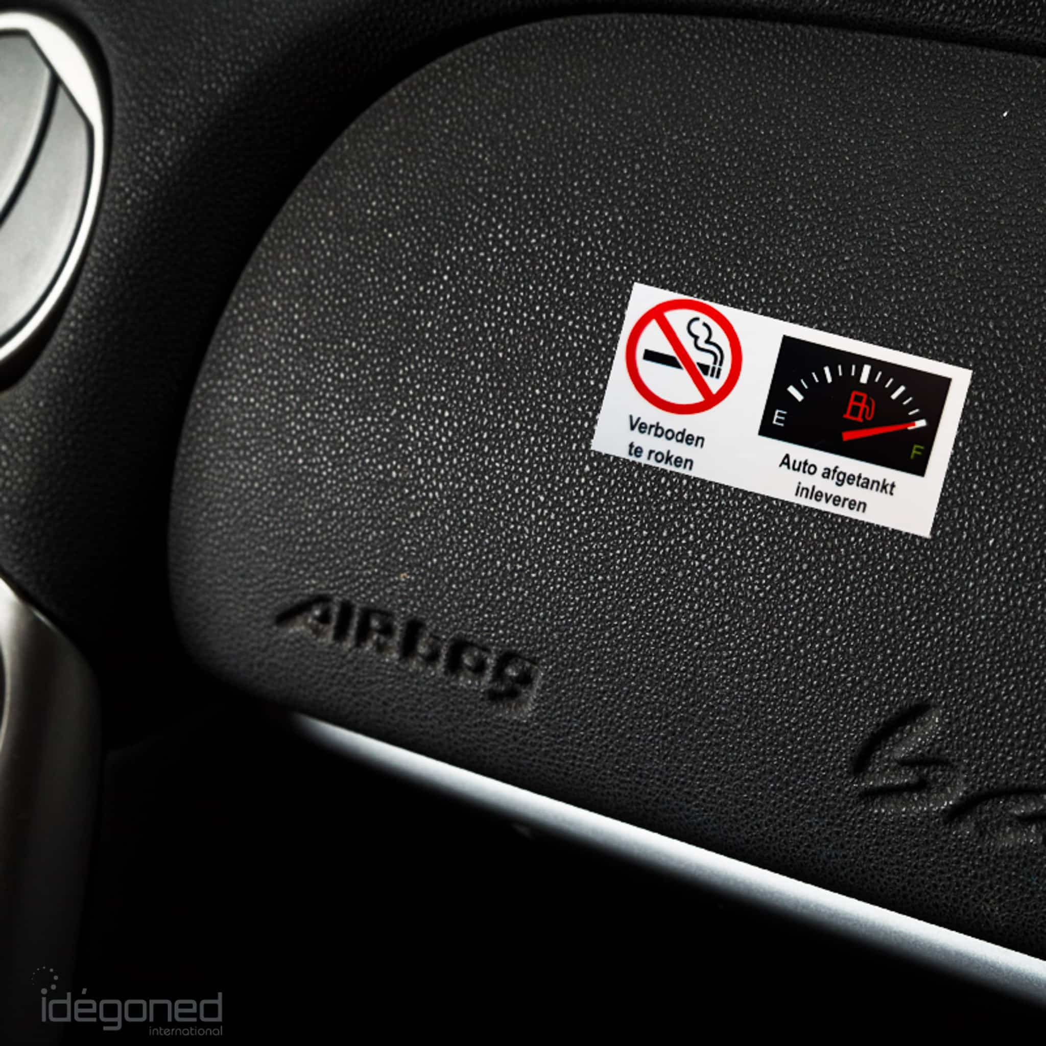 Op de stickers staat de tekst Verboden te roken en Auto afgetankt retour, beide voorzien van duidelijke symbolen.