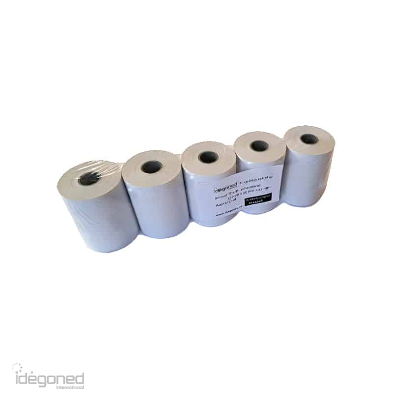Thermische pinrollen gemaakt van A-kwaliteit papier in de afmeting 57mm x 25m x 12mm. De pinrollen bevatten 25 meter papier per pinrol en zijn voorzien van einde strepen.