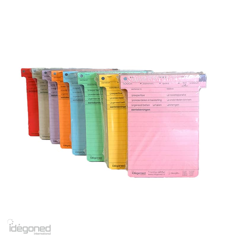 Zodra de afspraak met de klant is gemaakt, wordt de plankaart ingevuld en in het afsprakenpaneel gestoken. Wanneer de auto binnenkomt wordt deze kaart gesplitst en in het voortgangspaneel opgenomen: het bovenste deel op de dag dat de auto klaar moet zijn, het onderste deel op de dag dat de werkzaamheden aanvangen.