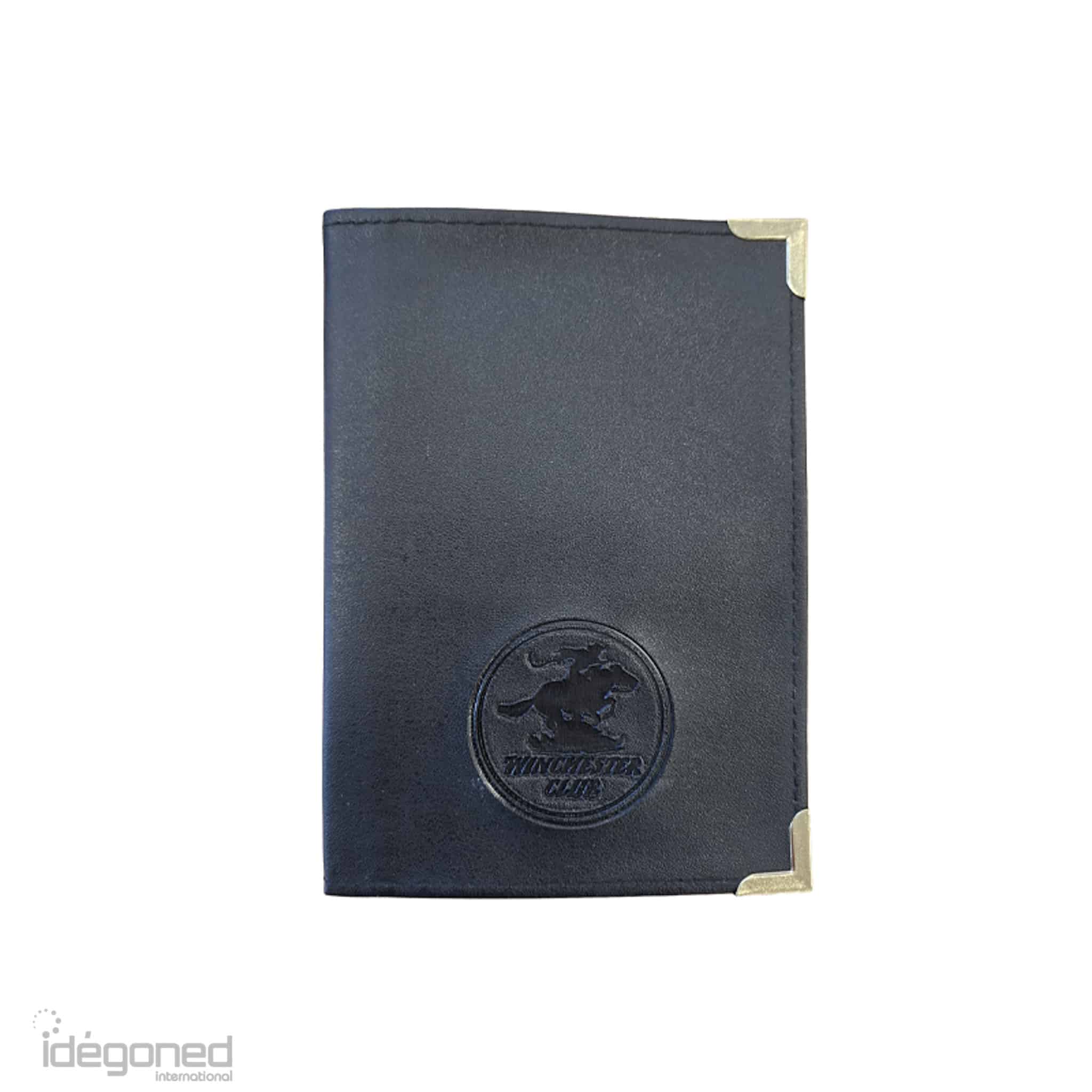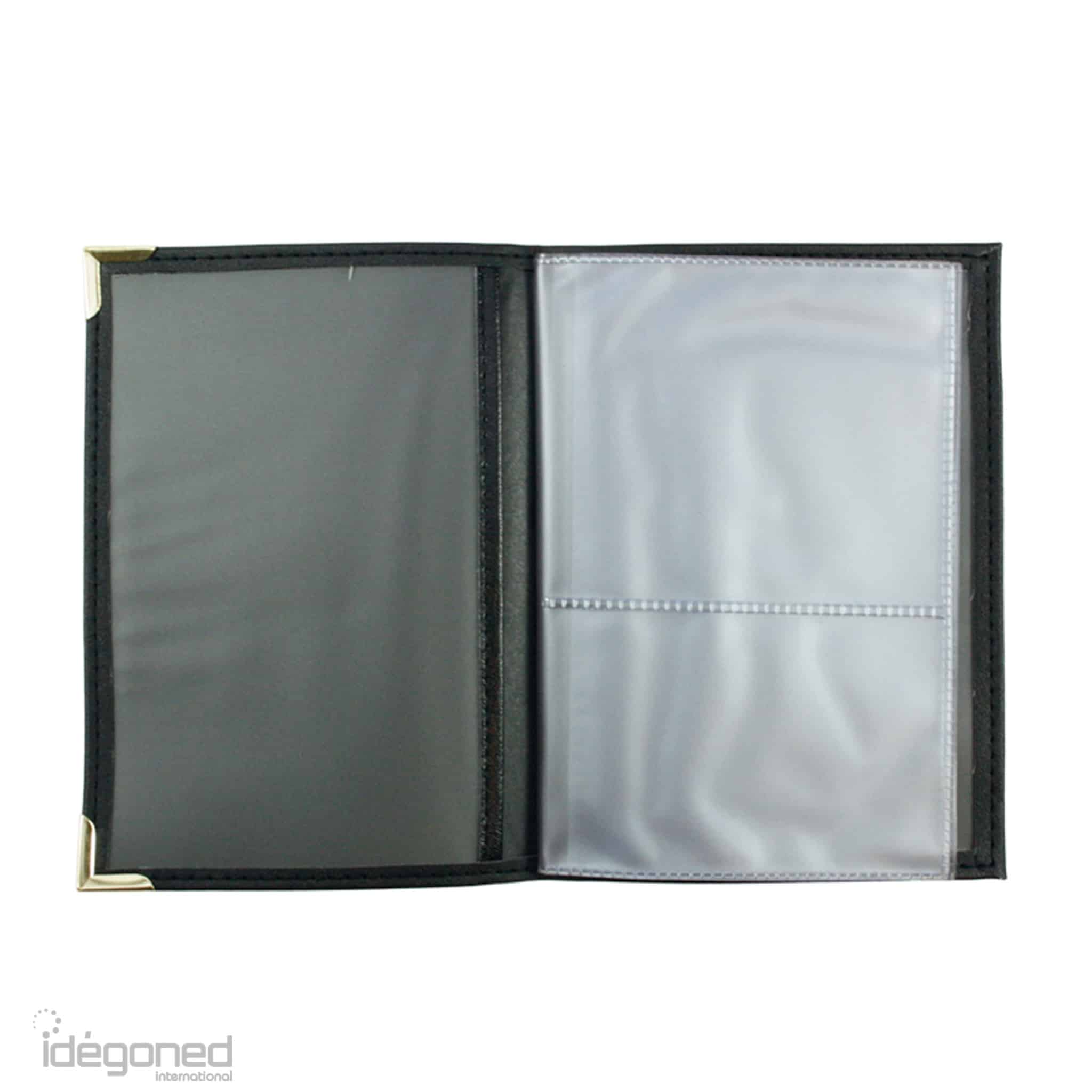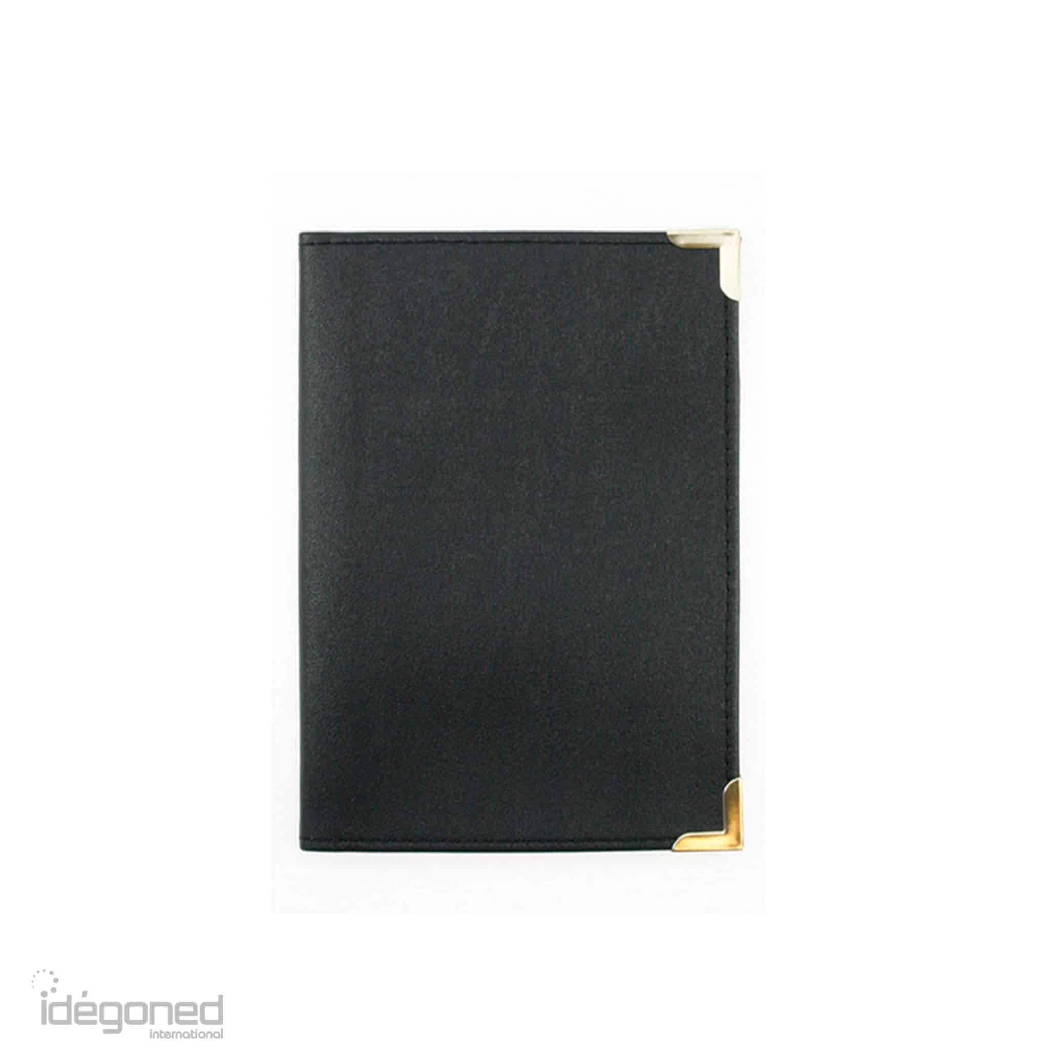 Skai opbergmapje met een matte uitstraling en 2 goudkleurige hoekjes aan de voorzijde.