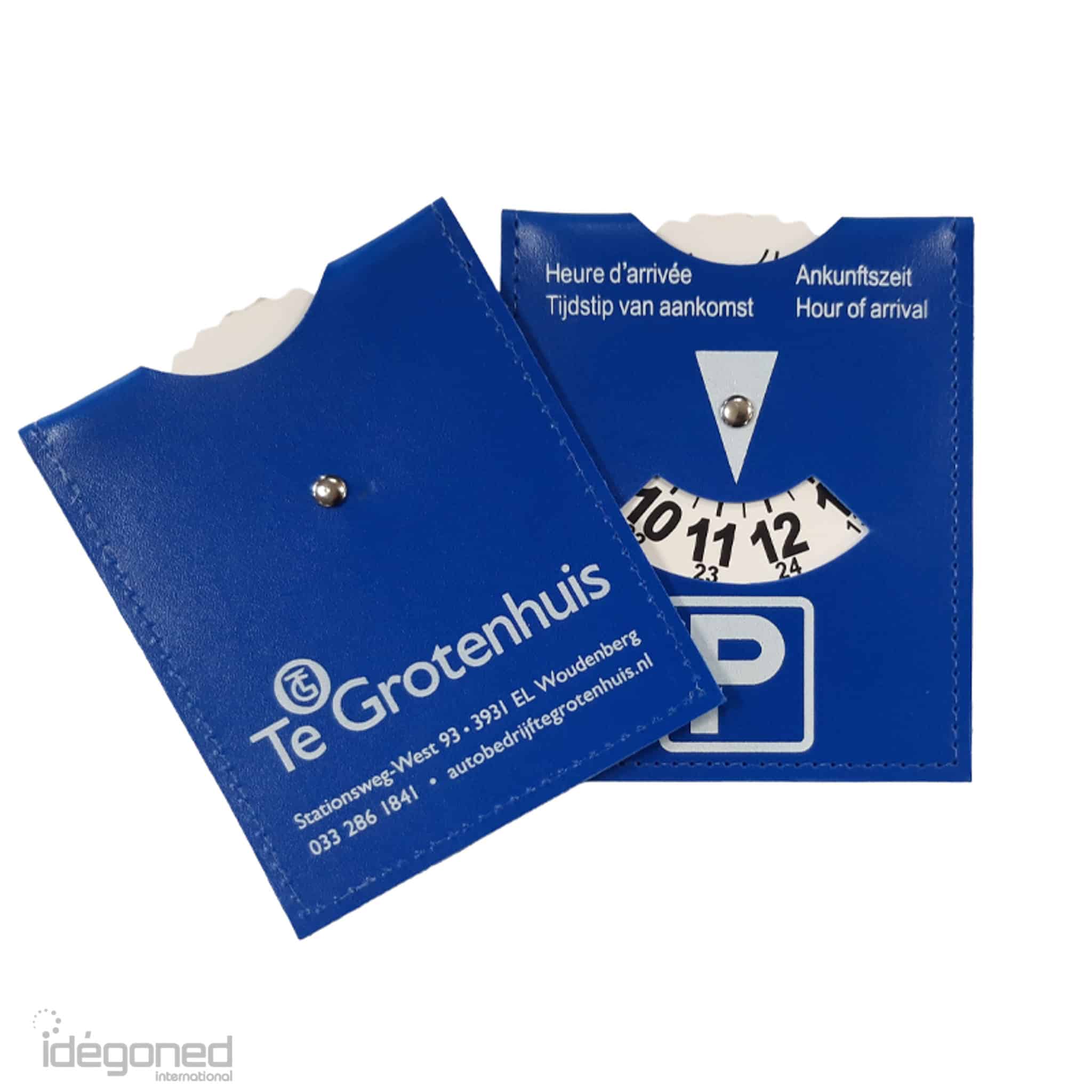 Met deze blauwe parkeerschijf is uw bedrijfsnaam en logo regelmatig in beeld bij uw klant.