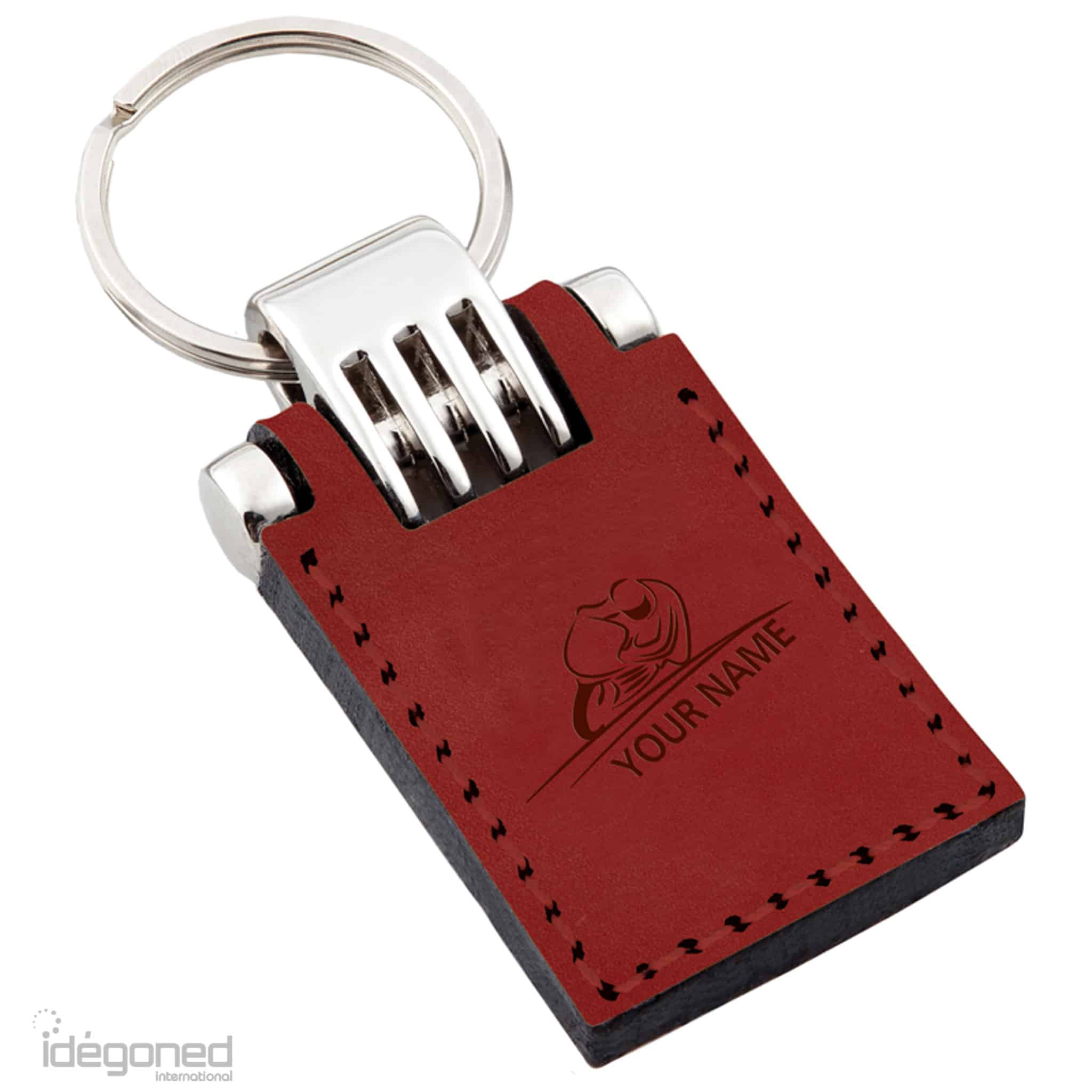 Stevige rechthoekige sleutelhanger met fraai metalen bovenstuk, uitgevoerd in leder of kunstleder.